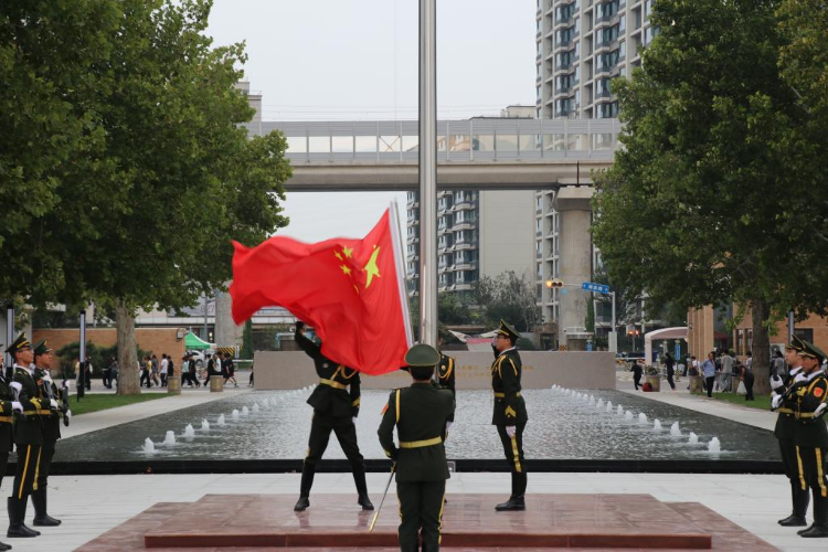上午7时整,升旗仪式在庄严肃穆的气氛中正式开始。学院国旗护卫队队员目光如炬、身姿挺拔,迈着铿锵有力、整齐划一的正步,护卫着五星红旗走向升旗台。